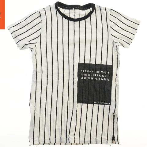 Kortærmet t-shirt med vandrette striber i brun og hvid. T-shirten har en rund halsudskæring.