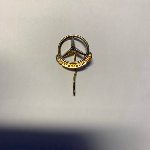 Mercedes-Benz emblem nål i guldfarvet metal. Nål med klassisk Mercedes-Benz stjerne-logo og lille laurbærkransdetalje i bunden. Kan anvendes som pynte- eller klubnål på jakke, kasket eller taske. Velegnet til samlere af Mercedes-Benz effekter eller som tilbehør til bilrelaterede arrangementer. Vægt 2,04 Gram Stemplet 585 Med blå safir sten og 1.000.000 km.