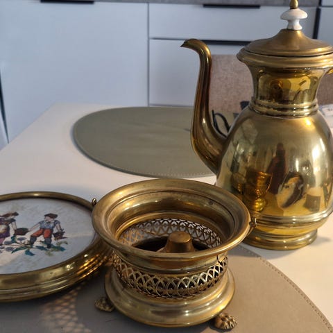 Messing kaffekande med tilhørende varmeskål.