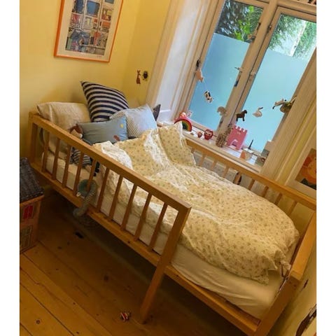 Brugt til mit barnebarn ved overnatning, hvorfor madrassen kun er brugt ganske få gange. Det midterste bræt i bunden er skiftet ud. Herudover medfølger en sengehest.