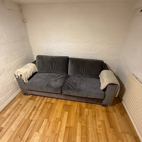 Pæn sovesofa i gråt betræk, mener den er fra Jysk. Betræk er ikke ødelagt men i god stand.