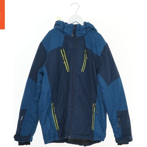 En grå jakke med flere lynlåslommer på forsiden. Jakken har en høj hals og pelskrave samt justerbare manchetter. Der er knapper på ryggen ved kraven.