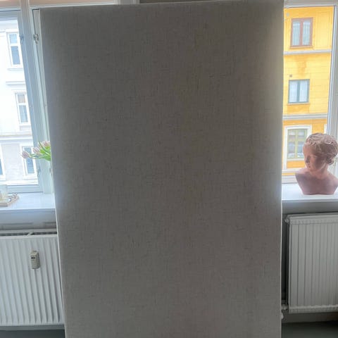 sengegavl 180cm i gråt betræk. står på ben og har en træramme.