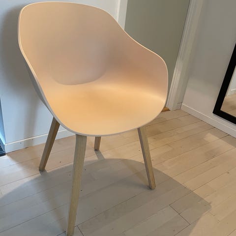 2 lækre hay a stole i model aac 23 fuldpolstret i lys nøbelstof stel i formspændt egetræ