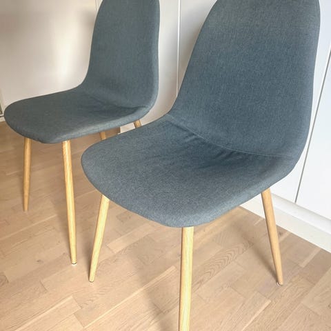 4 stk. spisestuestole i træ med polstret sæde og ryg. Stolene har stribet betræk i lyse og mørke nuancer samt dekorative detaljer på ryglænet. Egnede som spisebordsstole i køkken eller spisestue. Klassisk udtryk med drejede ben og synlige søm langs polstringen.