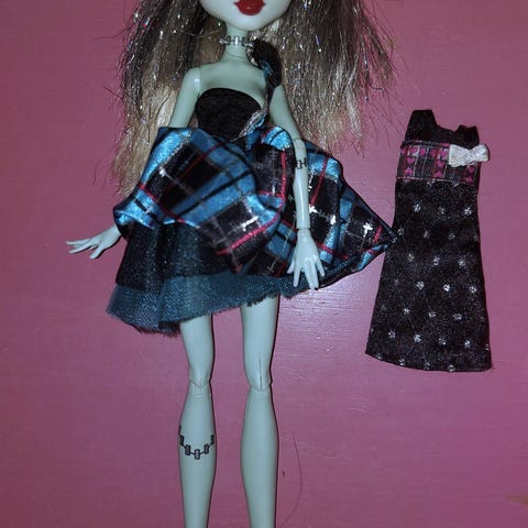 Dukke med langt lyserødt hår og store blå øjne. Dukken har grå bluse, skinnende nederdel og bælte samt hvidt tørklæde eller vest. Medfølgende tilbehør omfatter en hvid håndtaske og en lyserød hårbørste. Egnet som legetøj til børn, til leg med påklædning og styling af hår og tøj.