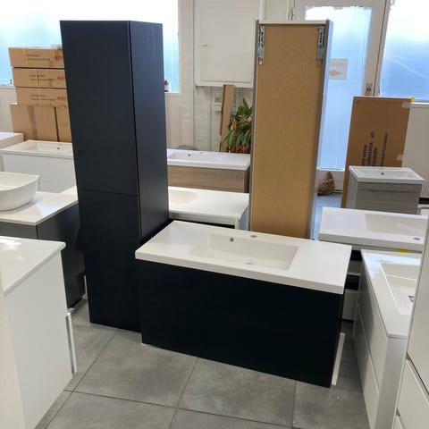Badeværelsesskabe fra Handcrafted Interior, helt nye, det ene skab er kun pakket ud for at tage billeder. I forbindelse med istandsættelse af vores hus, har vi 2 stk. skabe til overs. Ny pris 7.500 kr. pr. stk, sælges til 5.000 kr. pr. stk. Møblerne er i eg og sort. Møblet har sort korpus og fronter i egetræ med synlig årestruktur. Skufferne er udført med træsamlinger i siderne for øget stabilitet. Velegnet som opbevaringsmøbel i badeværelse, soveværelse eller f.eks. entre. Se tegninger for mål, det er de 2 skabe til højre og venstre der er til salg.