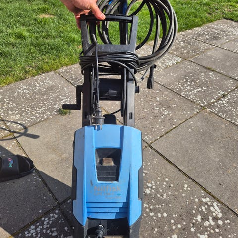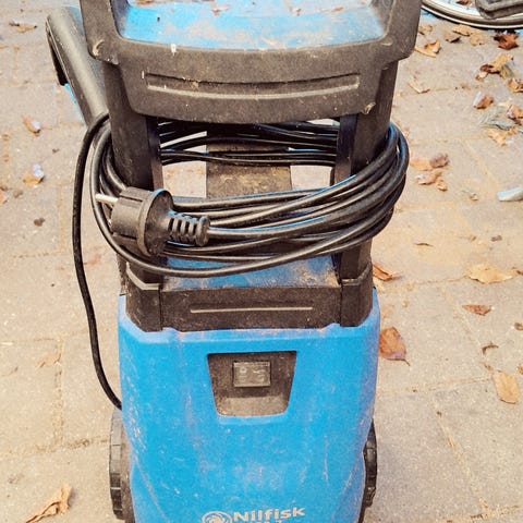 Medfølgende højtryksslange og sprøjtepistol ses på billederne. Velegnet til rengøring af fx terrasse, indkørsel, havemøbler eller cykler.