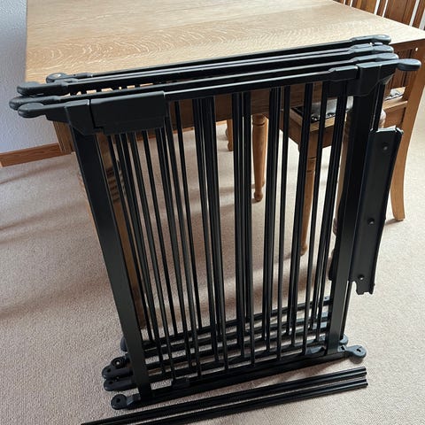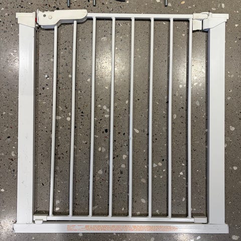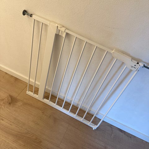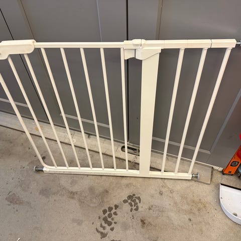 Sikkerhedsgitter i hvidlakeret metal. Gitteret består af lodrette tremmer og en ramme med lukkemekanisme i toppen. Gratis