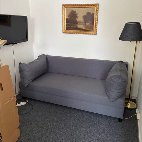 Sofaen er rengjort, men har skader, pletter og mærker, derfor den lave pris.