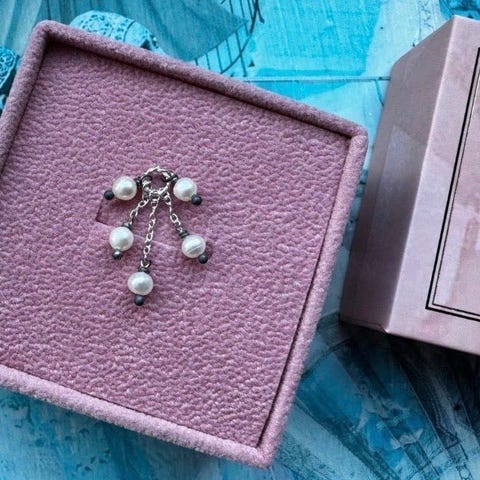 Charm i sterling sølv, og sat med hvide ferskvandsperler. Det sælges enkeltvis og kan bæres på en ørering, kæde eller ambånd.