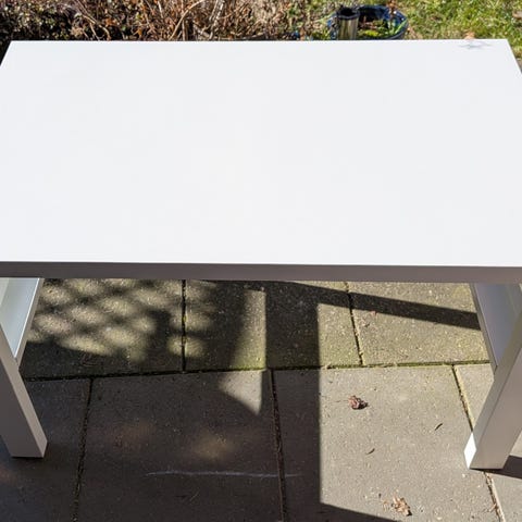 Ingen skader eller ridser. Lidt tusser på bordpladen som sikkert kan fjernes med sprit (se foto).
