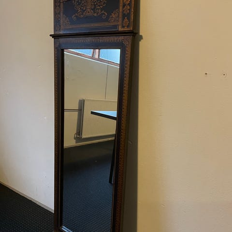 Gammelt mahogni konsolskab med spejl. Underskabet har en låge med fyldning og en skuffe øverst. Toppladen er udført med finér og markeret kant. Flot stand