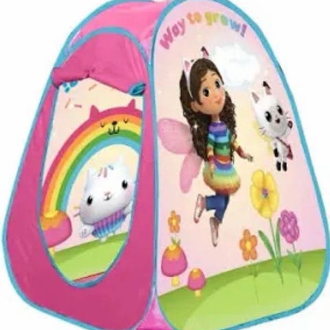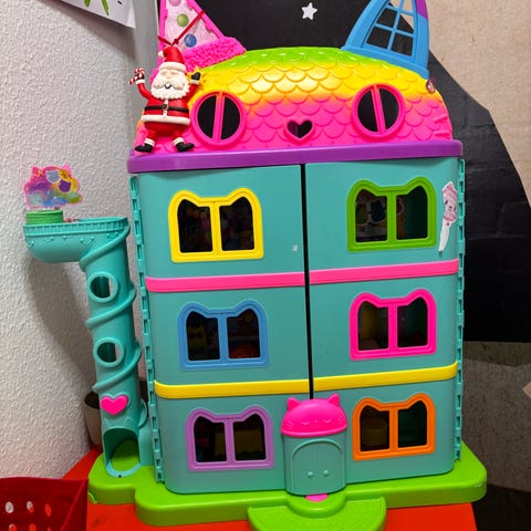 Gabby’s Dollhouse legehus med flere etager, elevator og tårn til levering af pakker. Huset har katte-design med lyserødt tag og turkis facade samt indretning med forskellige rum og farvede hylder. Der medfølger flere små figurer og tilbehørsdele, som kan placeres rundt i huset. Legehuset har en knap formet som et hjerte, der kan aktivere lydfunktion med miav-lyd.