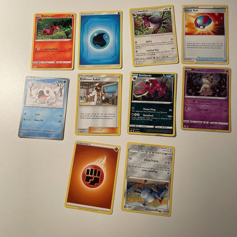 Pokémon kort lot med 10 stk blandede kort. Kortene omfatter forskellige typer, herunder energi- og trænerkort samt Pokémon-kort. Bagsiderne viser standard Pokémon Trading Card Game design. Velegnet til samling eller som supplement til eksisterende kortsamling.