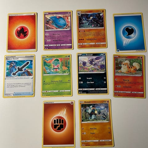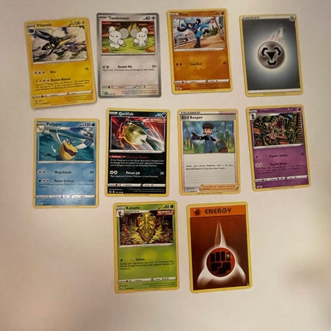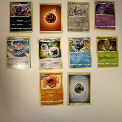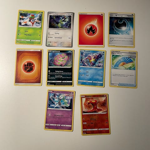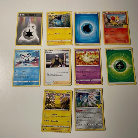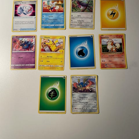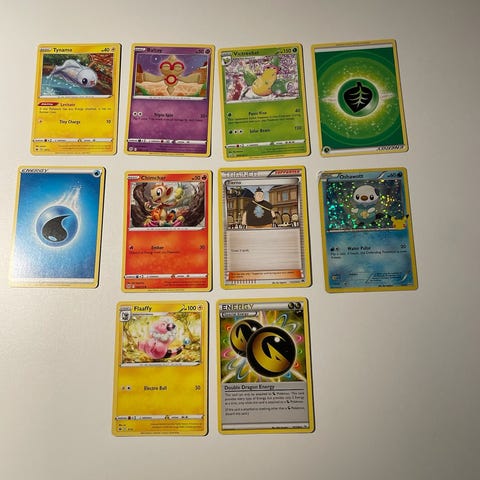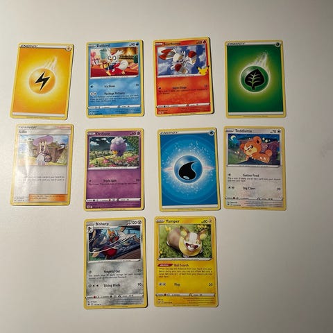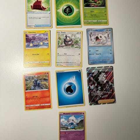 Pokémon kort lot med 10 forskellige kort. Blandet samling med både Pokémon-kort, energikort og trænerkort. Kortene er i standard størrelse og har almindelig Pokémon bagside. Velegnet til samling eller spil som supplement til eksisterende kortsamling.
