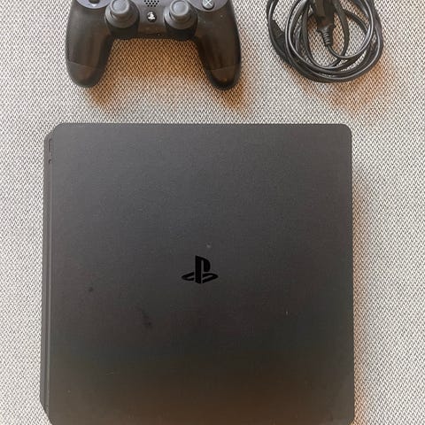 Sony PlayStation 4 Slim konsol i sort. Konsollen leveres med én DualShock 4 controller samt tilhørende strøm- og datakabel (hdmi), som ses på billederne. Egnet til spil, streaming og multimediebrug via HDMI-tilslutning til tv eller skærm.