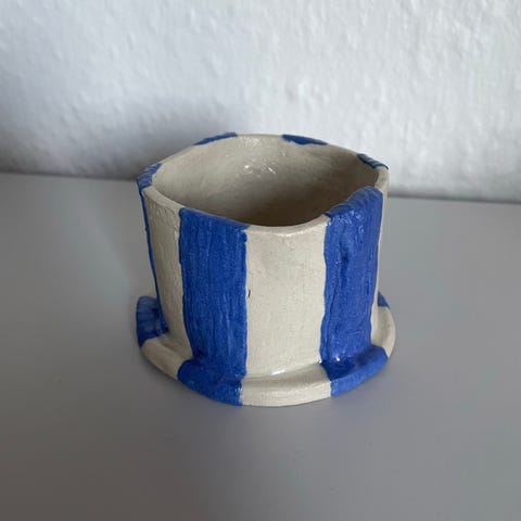 Keramik kop i stentøj med blå og hvide nuancer. Koppen har en ujævn, håndlavet struktur og organisk form. Velegnet til fx kaffe, te eller andre varme og kolde drikke. Kan også bruges dekorativt i indretningen, eksempelvis som lille vase eller beholder. Meget primitiv