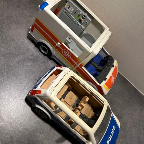 Playmobil blandet legesæt med køretøjer og figurer. Sættet omfatter blandt andet ambulance, politimotorcykel, rumskib, hestevogn med heste samt flere Playmobil-figurer og småtilbehør. Egnet til rolleleg med temaer som redning, politi, rumfart og western. Plastmateriale i forskellige farver.