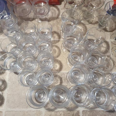 Sættet består af fem klare glas, hver med en fod. De har en højde på cirka 9 cm. Glassene er ideelle til servering af små drikkevarer eller som dekorative elementer. De har en klassisk form med en bredere top og snæver bund fastgjort til en fod, der sikrer stabilitet.