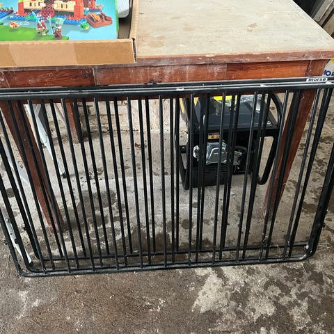 3-delt brændeovnsgitter i sort metal med lodrette sprosser. Egnet som afskærmning eller sikkerhedshegn indendørs eller udendørs, f.eks. ved trapper eller niveauforskelle.