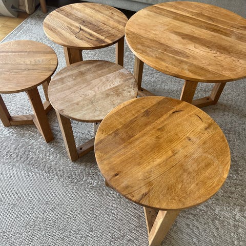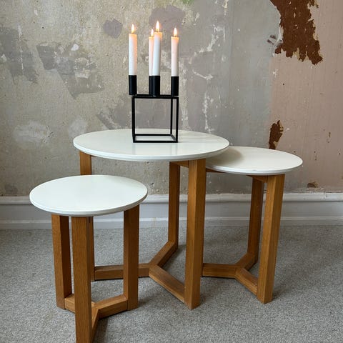 Sæt af runde sofaborde med glasoverflade og metalstel. Det store bord har en diameter på 51 cm og en højde på 51 cm, mens det lille bord har en diameter på 41 cm og en højde på 46 cm. Designet er ideelt til moderne indretning og giver et elegant touch til stuen.