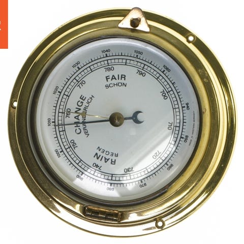 Messing vægur og et tilhørende barometer. Væguret har romertal og klassisk urdesign, drevet af et batteri, som er synligt fra bagsiden. Barometeret måler atmosfærisk tryk og har tal og indikatorer på dets ansigt. Begge objekter er cirkulære og har en diameter på 14 cm.