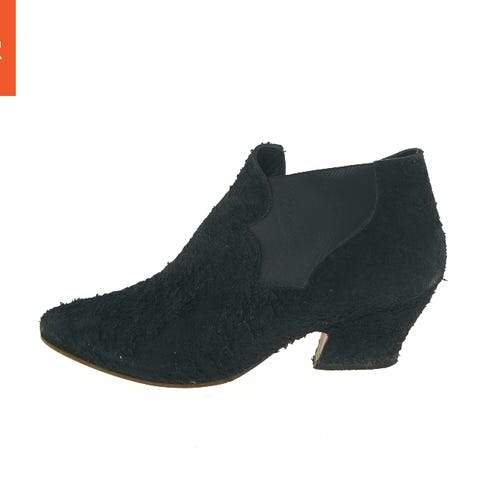 Et par stilfulde ankelstøvler til kvinder, fremstillet af blankt sort materiale. De har en firkantet hæl og spids front, og inkluderer lynlåse på indersiden for nem påtagning. Støvlerne har størrelse 38.