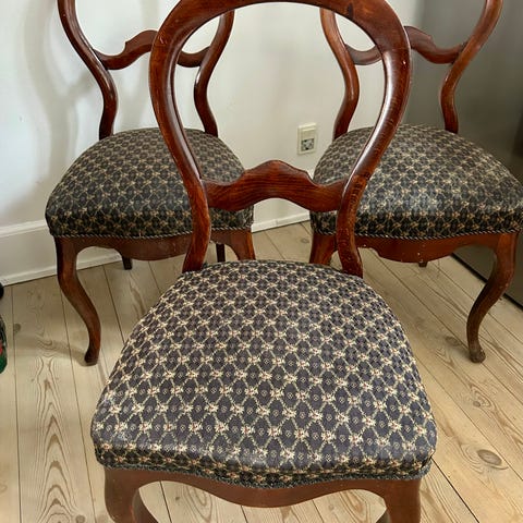 Sælger 6 flotte vintage stole med grøn polstring.