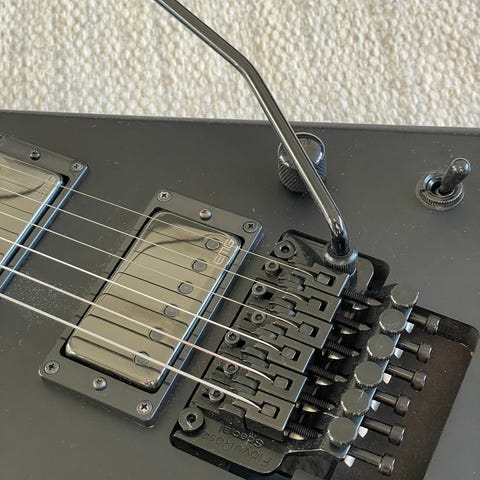 Klasse guitar sælges!! Der er tale om Jackson flying v. Den har 24 jumbo sized bånd, slank hurtig hals, Floyd Rose 1000, volume knap til hver pickup, og så har jeg opgraderet den med James Hetfield signatur EMG pickupsæt. Den lyder og spiller fantastisk!!! Den er som ny og har intet der minder om ridser, hakker eller bare generelt spor af brug.