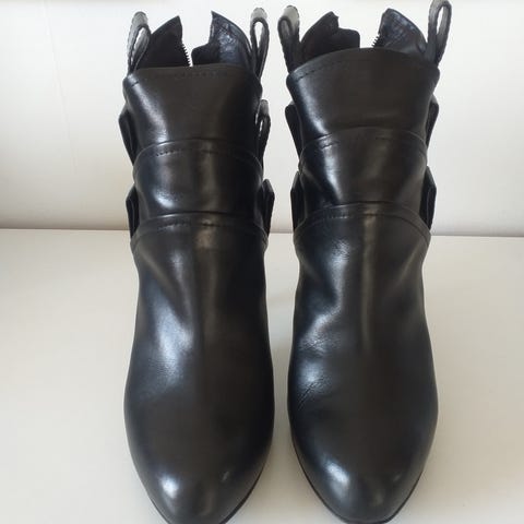 Et par sorte højhælede støvler med en diskret dyreprint detalje langs syningerne. Støvlerne har en elegant skrævet hæl og lynlås på indersiden, der gør dem nemme at tage af og på. De er i sort ruskind med ægte slangeskind . Stråler med et look, der kan kombineres med både hverdagstøj og festlige anledninger. Tags: støvler, dame, højhælede, sort, dyreprint.