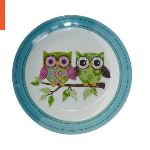 Tallerken med en diameter på 23 cm udstyret med et kunstnerisk motiv. Motivet er centreret og viser en farverig illustration, der kan ligne en dyrefigur. Der er en indre blå kant som del af designet. Bagsiden af tallerkenen har uklar skrift, der kan være en del af kunstnerens underskrift.
