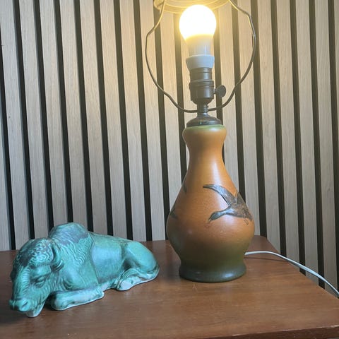 Dette er en bordlampe fra den danske terracotta-producent P. Ipsens Enke, som var aktiv fra 1843 til 1955. Virksomheden er kendt for at have inviteret store kunstnere som Thorvald Bindesbøll og Georg Jensen til at designe værker, der ofte var inspireret af naturens elementer og former.