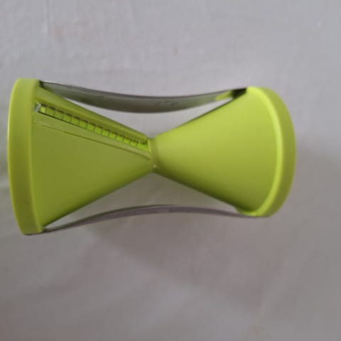Dette er en spiral skærer, der bruges til at lave grøntsagsstrimler. Den har en timeglasform med sorte plast- og metaldele. De skarpe blade skærer effektivt spiraler af grøntsager som gulerødder, zucchini og andre lignende ingredienser. Den kommer i en emballage, der viser eksempler på brugen. Målene er 14 cm i højden.