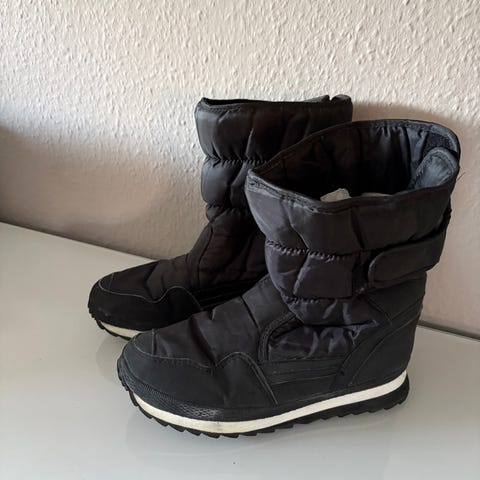 Disse er et par sorte vinterstøvler i størrelse 37. De er foret for varme og har en justerbar snøre for bedre pasform. Støvlerne har en robust og skridsikker sål, ideel til vinterforhold.