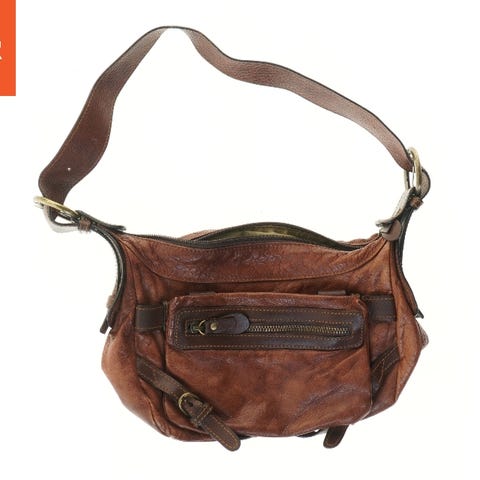 En brun læder skuldertaske med justerbar strop. Tasken har flere lynlåslommer på forsiden for ekstra opbevaringsplads og en enkel lynlåslomme bagpå. Den kompakte størrelse på 27x22 cm gør den ideel til daglig brug eller rejser, hvor du har brug for nem adgang til dine ejendele. Tasken viser et klassisk design, perfekt til en casual stil. Der er et logo indgraveret på bagsiden af tasken.