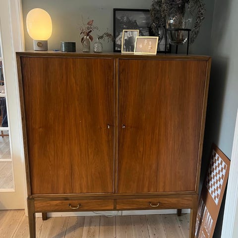 Super flot og lækkert skab i teaktræ. Skydelågerne at nogle utroligt elegante greb og begge låger glider nemt.