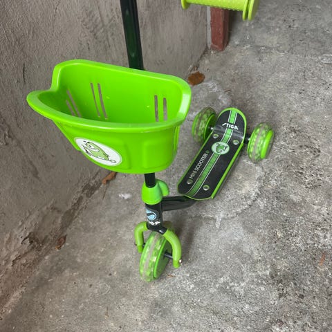 STIGA løbehjul med tre hjul i blå farve. Løbehjulet har to forhjul og ét baghjul for øget stabilitet. Dækkene er i semi blød plast, og stellet er i let plast- og metalmateriale. Styret er højt og lige, og der er en lille taske/pose monteret foran på styret. Egnet til børn, som ønsker et stabilt løbehjul til kørsel på jævne underlag som fx fortov og indendørs gulve.