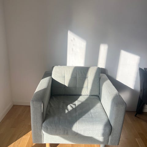 Lænestol og puf i mørkegrå. Fra hjem med hund. Trænger til en grundig støvsugning og rens.