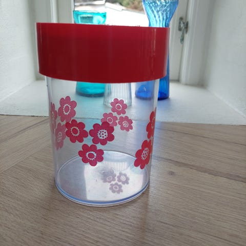 Erik Kold opbevarings bøtte med vacum låg, i pæne røde farver og intakte striber, 1,7 liter