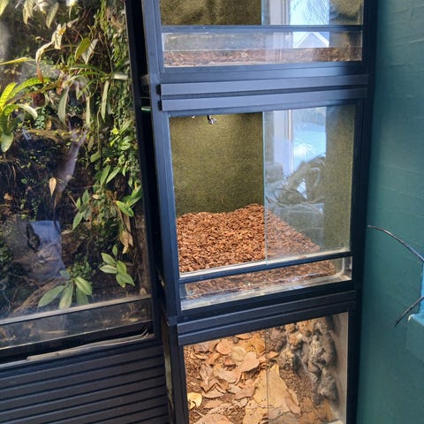 Terrariereol med 4 stk terrarier der er stablet af 80x50x50. De er vådrumssikret med skibslak og på nuværende tidspunkt kører jeg et bioaktivt setup i dem som det fungerer fint med.
