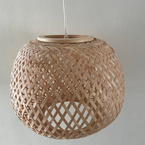 Denne pendel er lavet af bambus, formet som en pære, og har en ledning med en stikkontakt til ophæng. Lampen er designet med et åbent gittermønster, der giver et dekorativt og naturligt udseende. Ideel til brug i stue, spisestue eller køkken som en stilfuld lyskilde. Tags: pendel, bambus, belysning