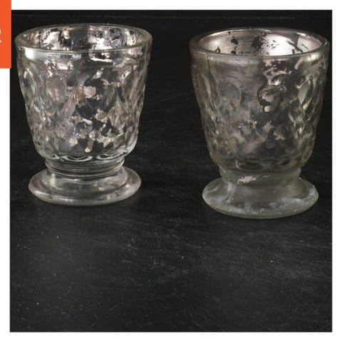 2 glas til stearinlys indeni, Ukendt, 2 glas, 1 rødt, 1 klar, med hvide stearinlys støbt indeni. Når man har brændt lysene kan glassene bruges til fyrfadslys eller evt. til drikkeglas. Stearinen er ikke ren, men glassene er intakte og flotte.