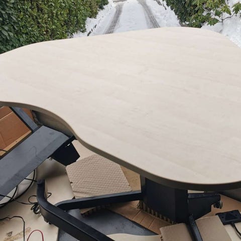 Skrivebord i hæve-/sænkbar model med bordplade i lyst træ og gråt metalstel. Bordet har central søjle med elektrisk højdejustering og med hjul i den ene ende, hvilket gør det nemmere at flytte. Bordpladen har en synlig ridse, som fremgår af billedet. Velegnet som arbejds- eller kontorbord, fx hjemmekontor, hvor der er behov for justerbar arbejdshøjde.