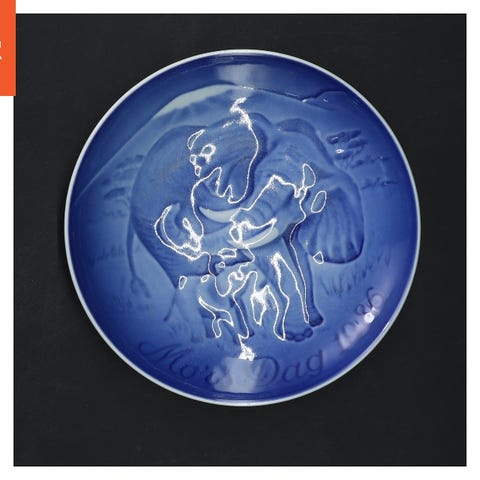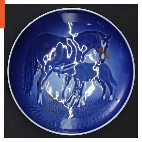 Porcelænstallerken med en diameter på 15 cm, der har en bemærkelsesværdig blå inderside med et dekorativt mønster. På ydersiden af tallerkenen står der trykt 'Mors Dag 1977', hvilket antyder, at det er en samlerobjekt eller en speciel udgave. Bagsiden af tallerkenen har et stempel, der viser 'B&G' og kan indikere, at det er en Bing & Grøndahl porcelænstallerken. Der er også en lille metaltråd bagpå, som gør det muligt at hænge tallerkenen som dekoration. Tags: porcelæn, samlerobjekt, dekoration, morsdag.