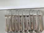 10 stk. middags gaffel, længde 19,5 cm, lidt brugsrelateret slid på nogle af gaflernes spids (se foto)