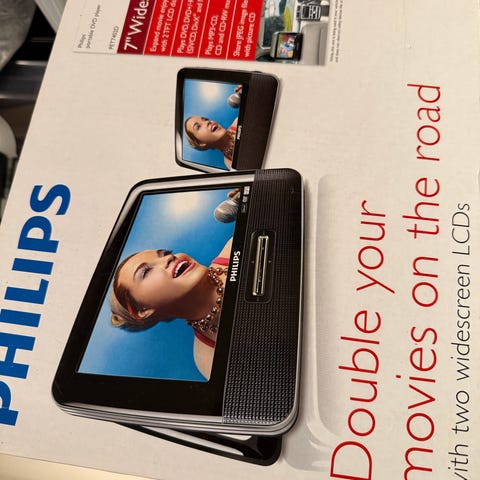 Philips bærbare dvd-afspillere med skærme. Sættet består af to skærmenheder med integreret dvd-afspiller, strømforsynere, kabler og brugervejledning. Velegnet til afspilning af dvd-film og andet kompatibelt medie, f.eks. i bil eller hjemme, hvor der er behov for en kompakt skærm- og afspillerløsning.
