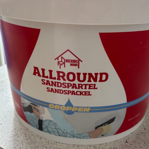 Den er let, flot færdig sandspartelmasse, anvendes indendørs rum loft og vægge,