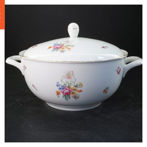 Denne er en elegant serveringsskål med låg lavet af porcelæn. Skålen er dekoreret med et smukt blomstermønster og har en gylden knop på låget samt elegante håndtag på siderne. Den måler 27x17x8 cm, hvilket gør den praktisk til servering af diverse retter. Bunden af skålen har også en dekoration samt en mærkning.