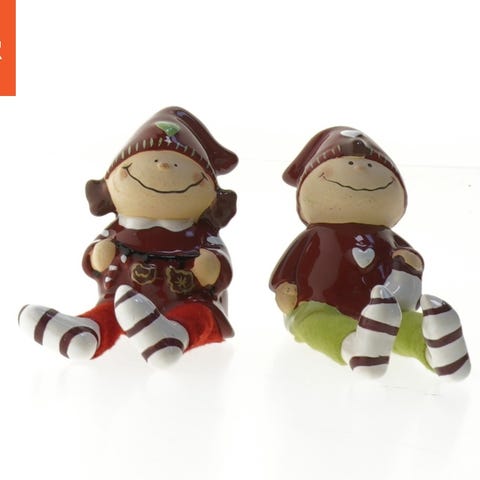 Sæt med to keramiske julefigurer, hver cirka 8 cm i størrelse. Figurerne forestiller glædelige elverbørn, klædt i farverige julekostumer med stripede strømper og små hatte. Den ene figur har grønne strømper og holder en hjerteformet dekoration, mens den anden har røde strømper og bærer en møntdekoration. Begge figurer er lavet af keramik og har et skinnende ydre med malede detaljer. De har en hyggelig og festlig udstråling, der passer perfekt til juledekorationer.